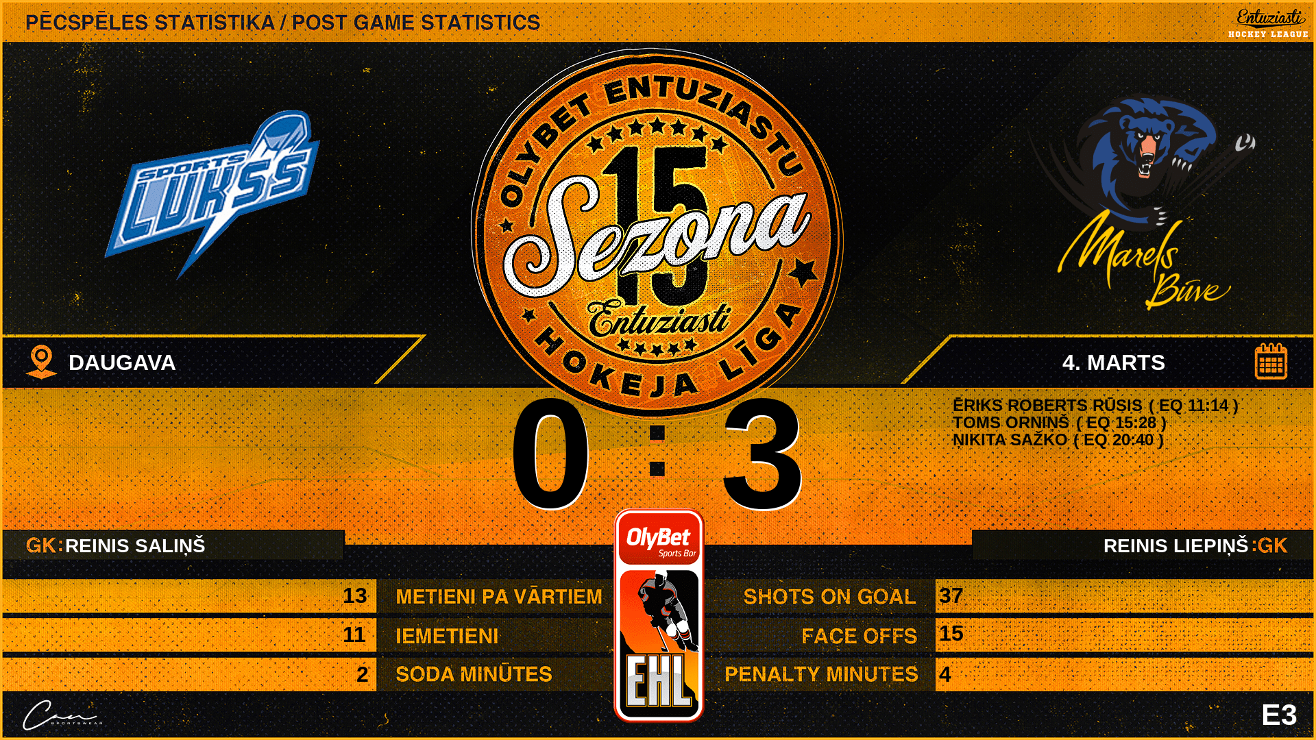 | 11:14 | MBV | Vārti (EQ) SP2 0 : 1 MBV | #7 Ēriks Roberts Rūsis, piespēles: #23 Viesturs Velšs, #21 Ingus Matiņš |
