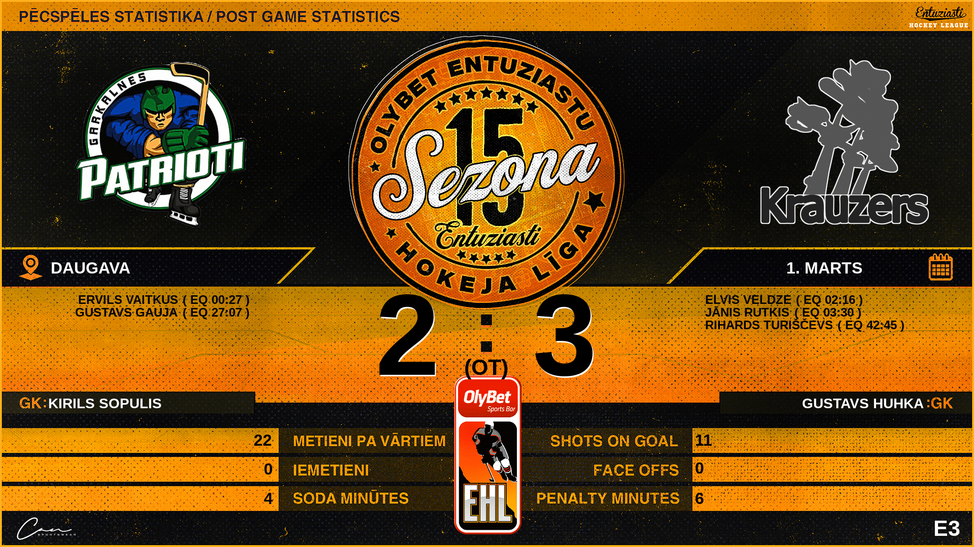 | 27:07 | GP2 | Vārti (EQ) GP2 2 : 2 KRZ | #7 Gustavs Gauja, piespēles: #93 Rinalds Rautenšilds, #15 Nils Nikolajevs |