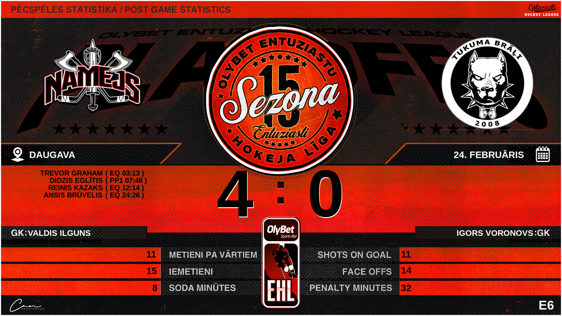 | 12:14 | NMJ | Vārti (EQ) NMJ 3 : 0 TB4 | #77 Reinis Kazaks, piespēles: #37 Trevor Graham, #22 Lauris Bļodons |