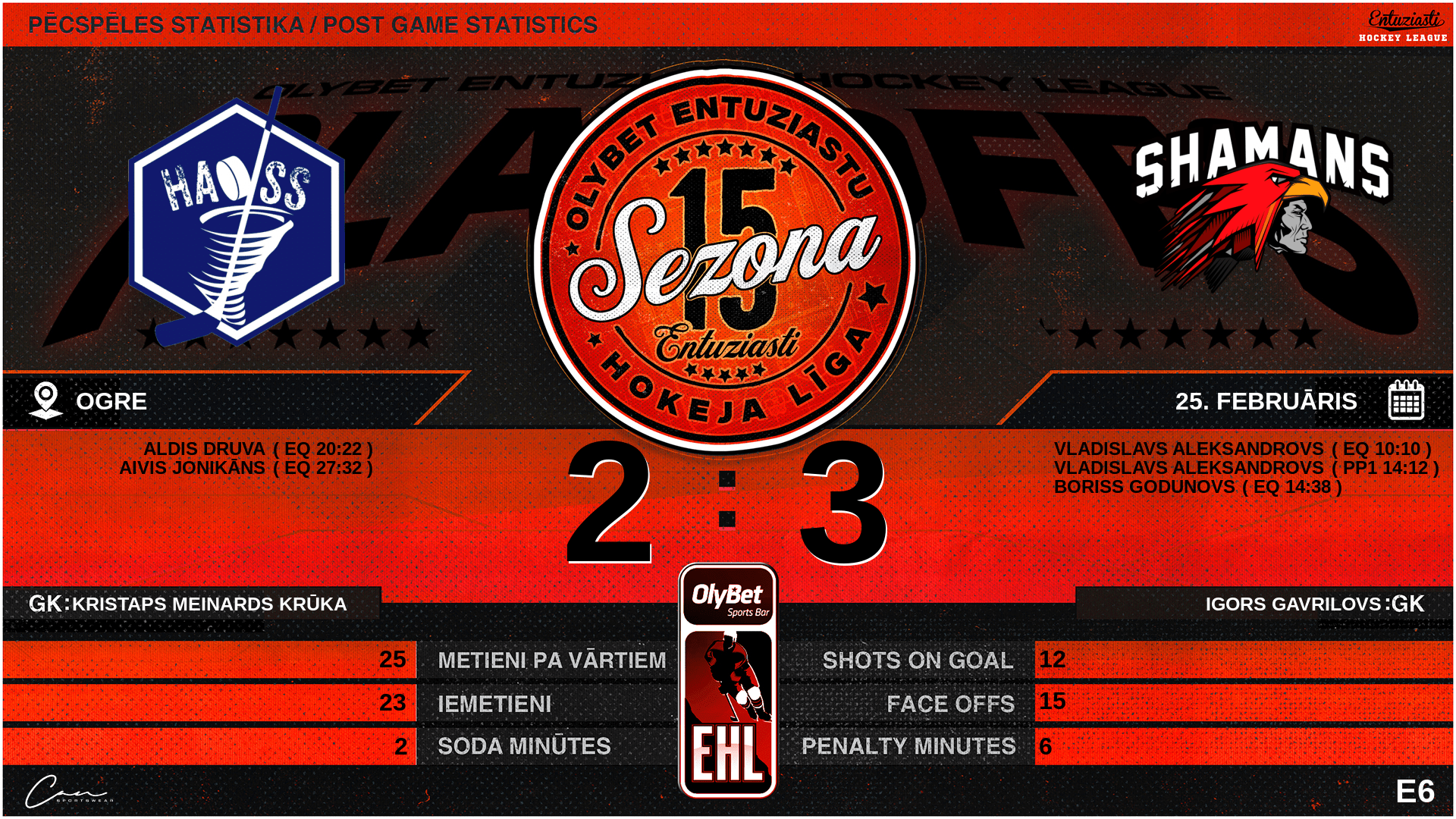 | 10:10 | SHM | Vārti (EQ) HAS 0 : 1 SHM | #91 Vladislavs Aleksandrovs, piespēles: #24 Jurijs Kulikovs, #10 Kristofers Vaitonis |