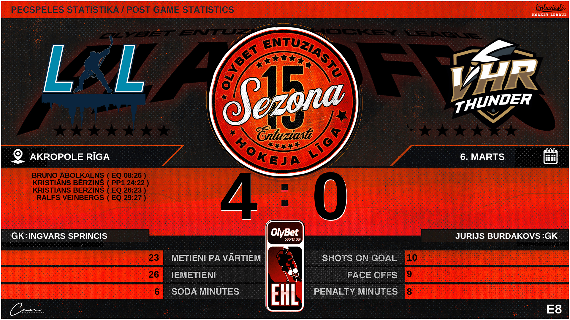 | 26:23 | LLL | Vārti (EQ) LLL 3 : 0 VHR | #36 Kristiāns Bērziņš, piespēles: #92 Bruno Ābolkalns |