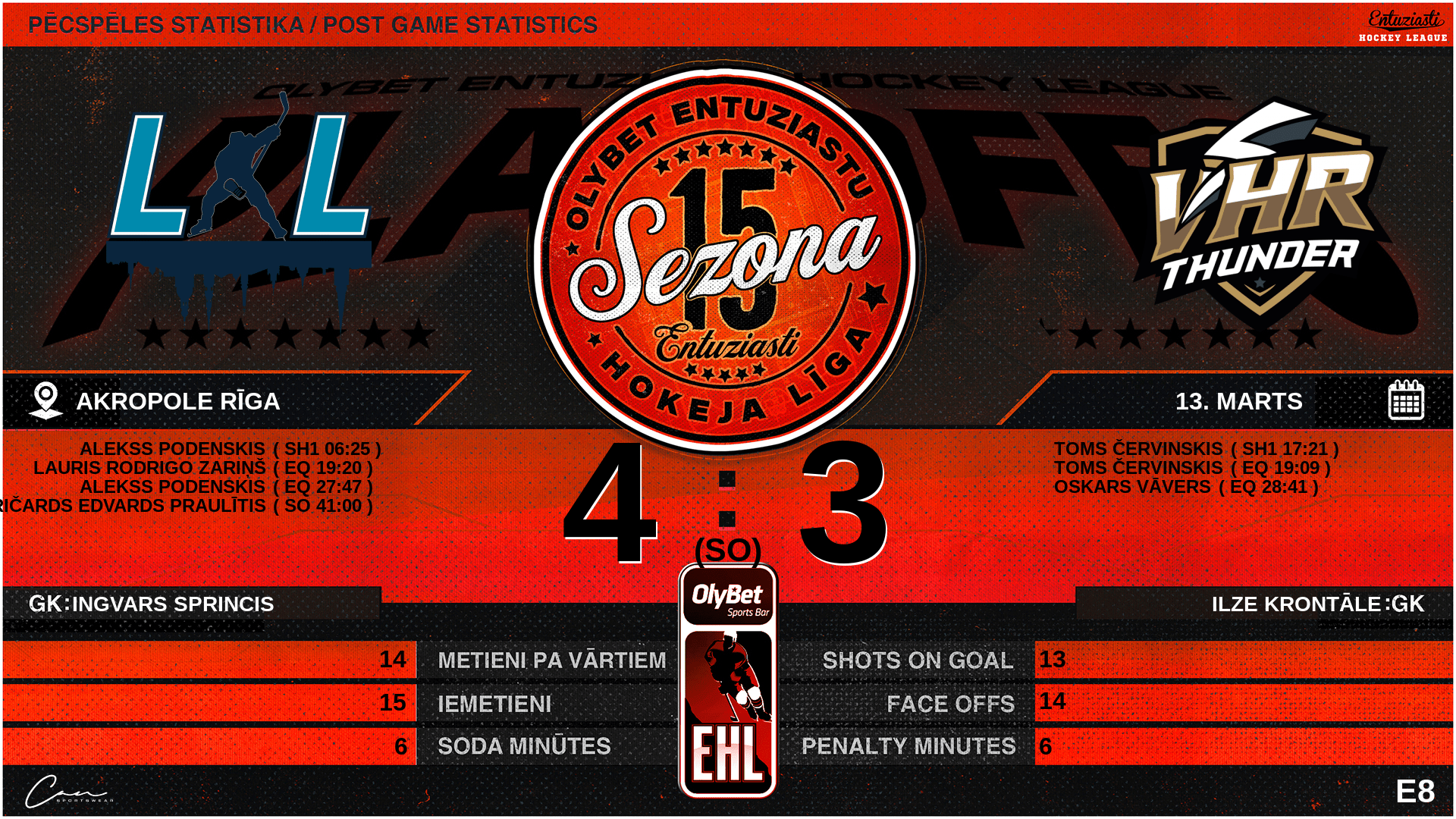 | 41:00 | LLL | Vārti (SO) LLL 4 : 3 VHR | #8 Ričards Edvards Praulītis |