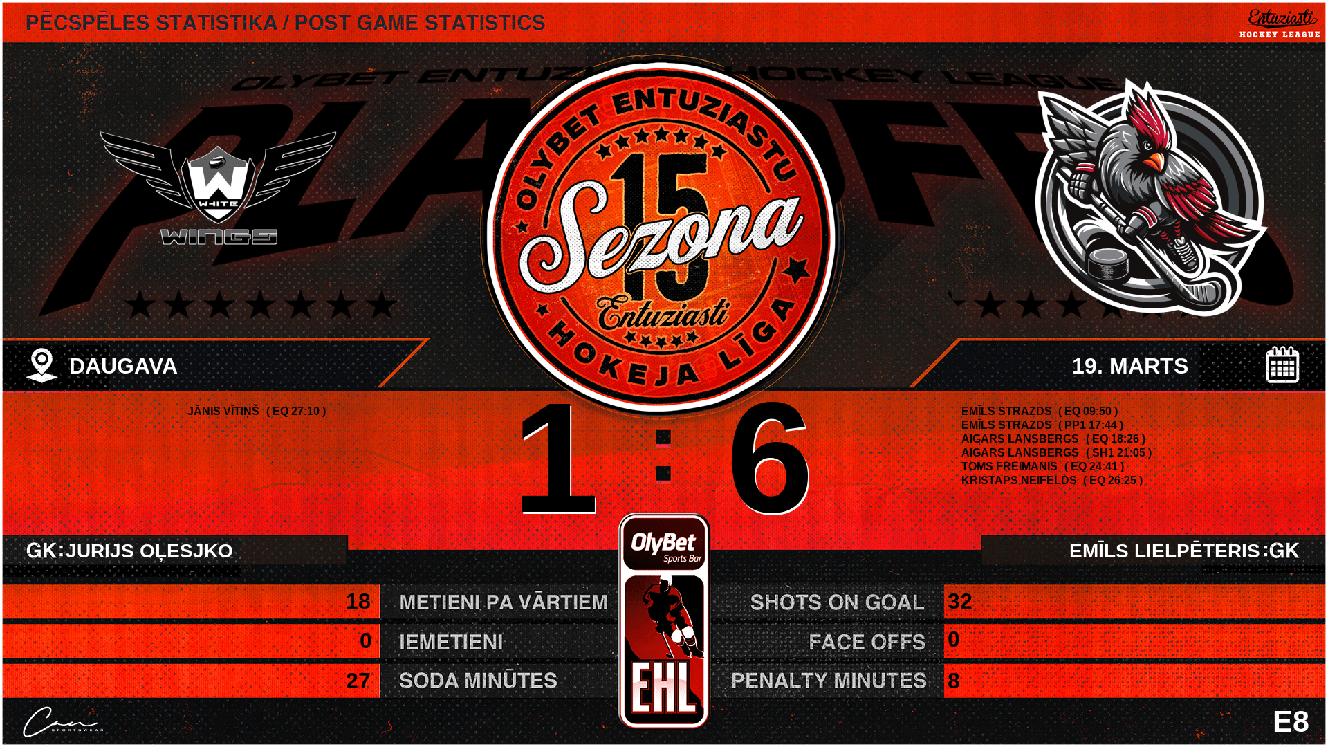| 27:10 | WTW | Vārti (EQ) WTW 1 : 6 PLK | #9 Jānis Vītiņš, piespēles: #18 Kaspars Indriksons, #4 Ingus Strods |