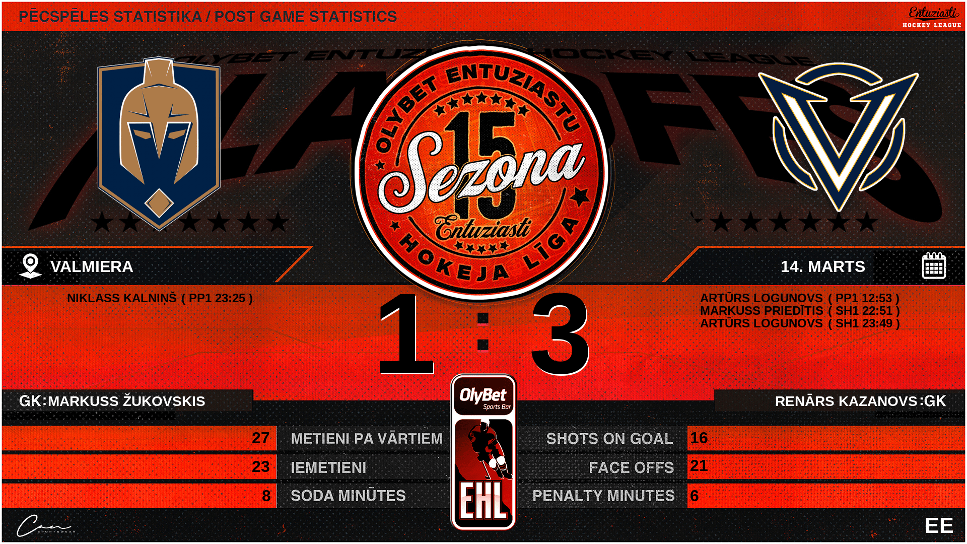 | 23:49 | VCT | Vārti (EQ) VLM 1 : 3 VCT | #29 Artūrs Logunovs, piespēles: #18 Markuss Priedītis, #12 Artūrs Ozoliņš |
