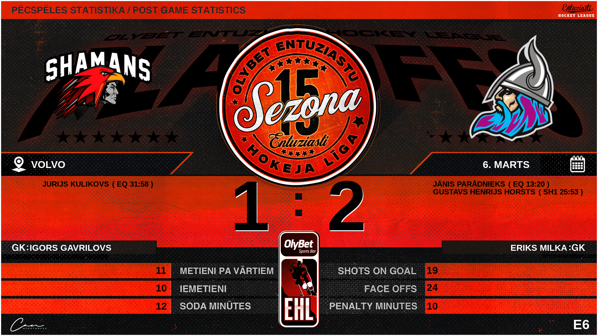 | 31:58 | SHM | Vārti (EQ) SHM 1 : 2 LDV | #24 Jurijs Kulikovs |