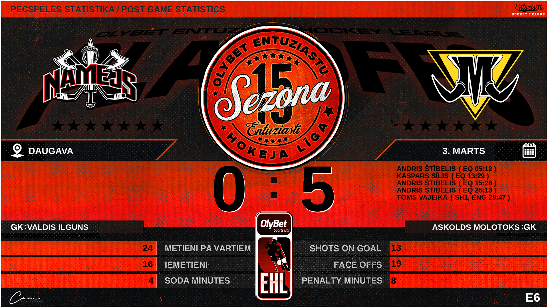 | 05:12 | MTH | Vārti (EQ) NMJ 0 : 1 MTH | #27 Andris Štībelis, piespēles: #13 Kaspars Sīlis, #55 Kristaps Čudars |