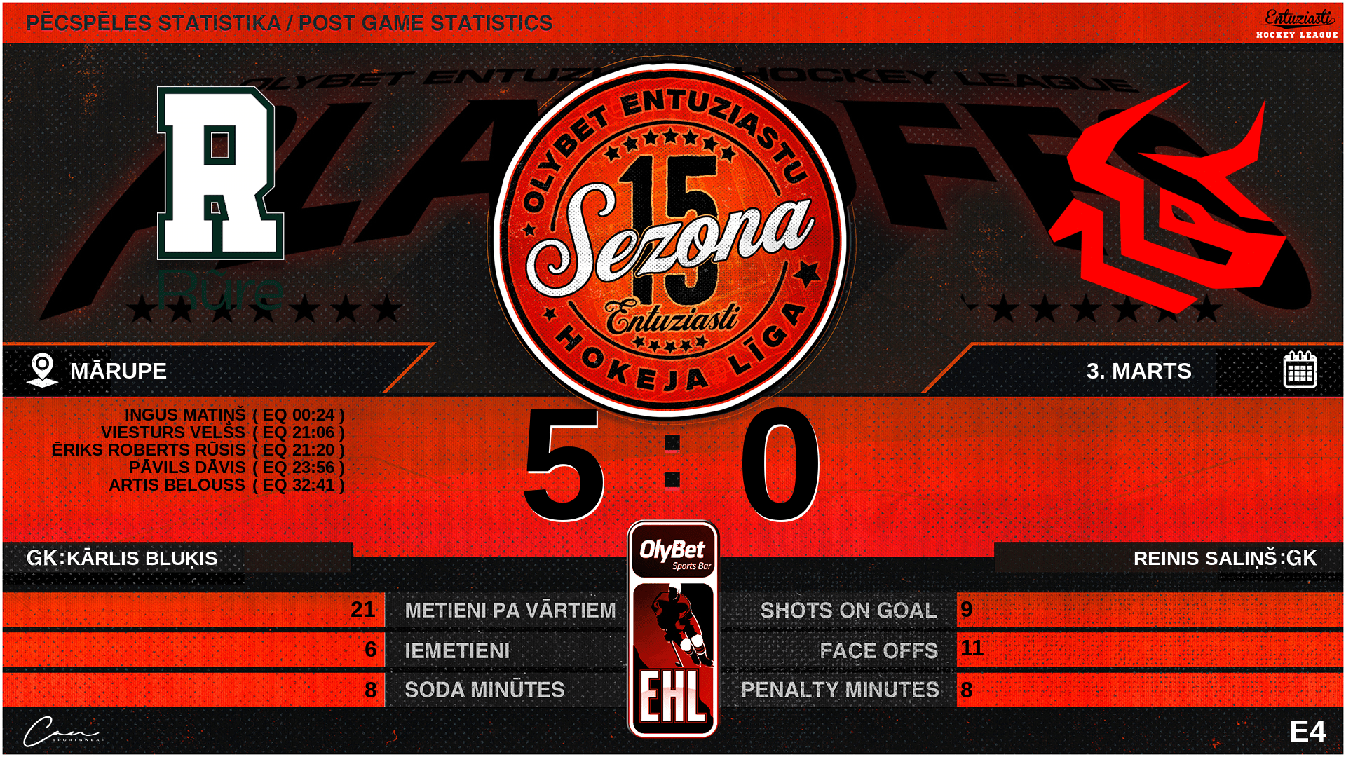 | 21:20 | RUR | Vārti (EQ) RUR 3 : 0 TRS | #97 Ēriks Roberts Rūsis, piespēles: #3 Viesturs Velšs, #9 Ingus Matiņš |