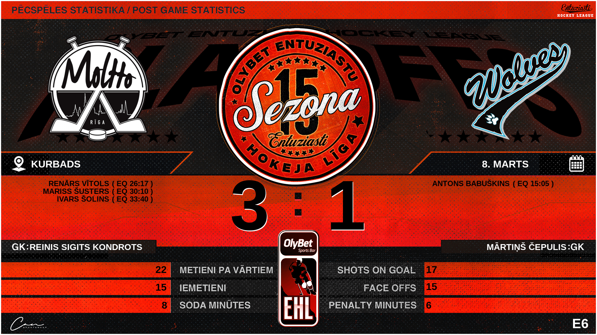 | 15:05 | WF3 | Vārti (EQ) MTO 0 : 1 WF3 | #26 Antons Babuškins, piespēles: #92 Robins Dedzis, #84 Aleksejs Carjovs |