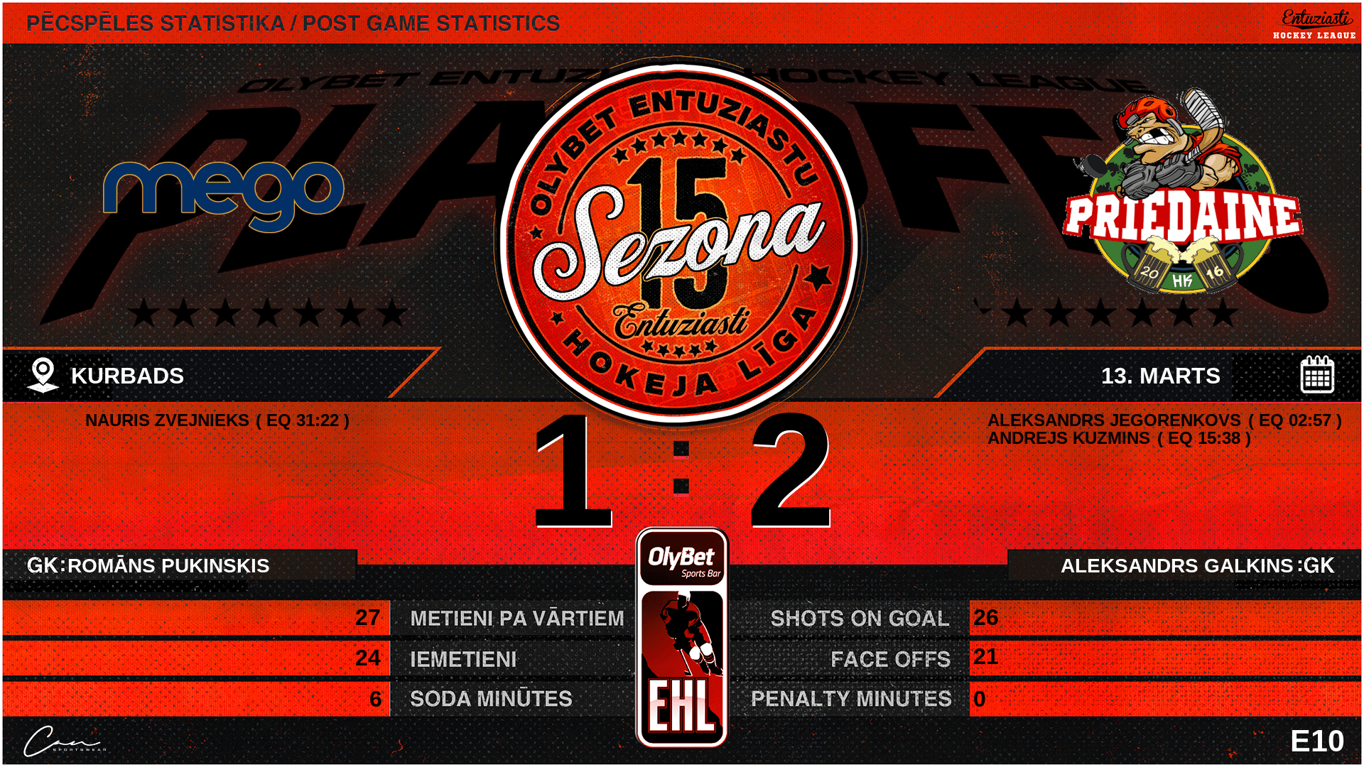 | 02:57 | PR2 | Vārti (EQ) MG2 0 : 1 PR2 | #10 Aleksandrs Jegorenkovs, piespēles: #68 Andrejs Kuzmins |