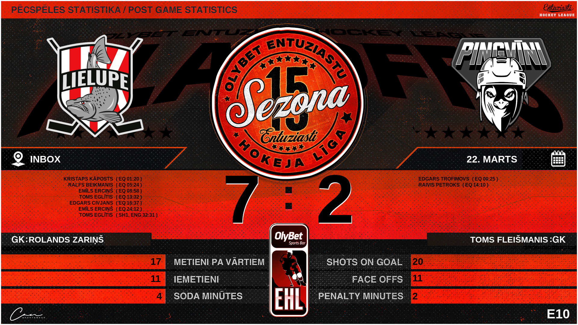 | 00:25 | PNX | Vārti (EQ) LLR 0 : 1 PNX | #71 Edgars Trofimovs, piespēles: #77 Vilis Skujenieks |