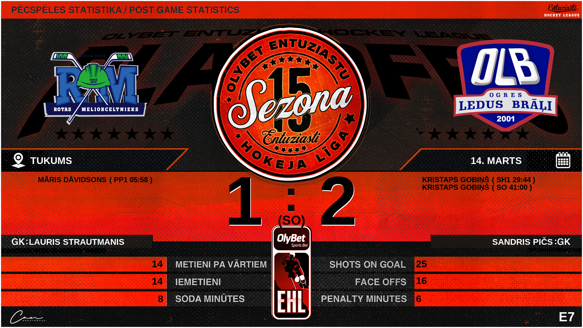 | 29:44 | OL2 | Vārti (SH1) RT2 1 : 1 OL2 | #7 Kristaps Gobiņš, piespēles: #42 Raimonds Zemzāle, #91 Rūdolfs Kudļa |