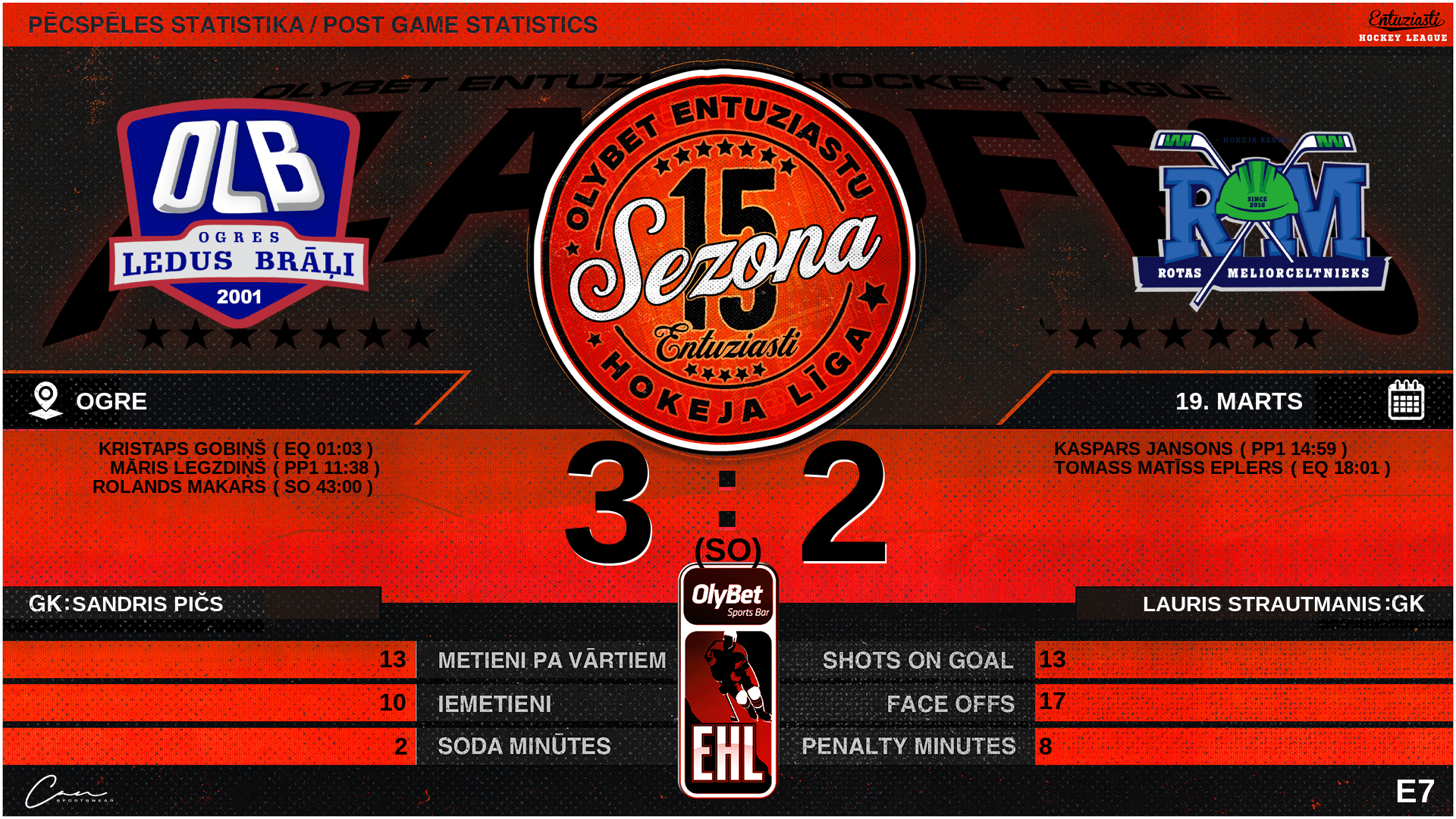 | 43:00 | OL2 | SO vārti | #7 Kristaps Gobiņš |