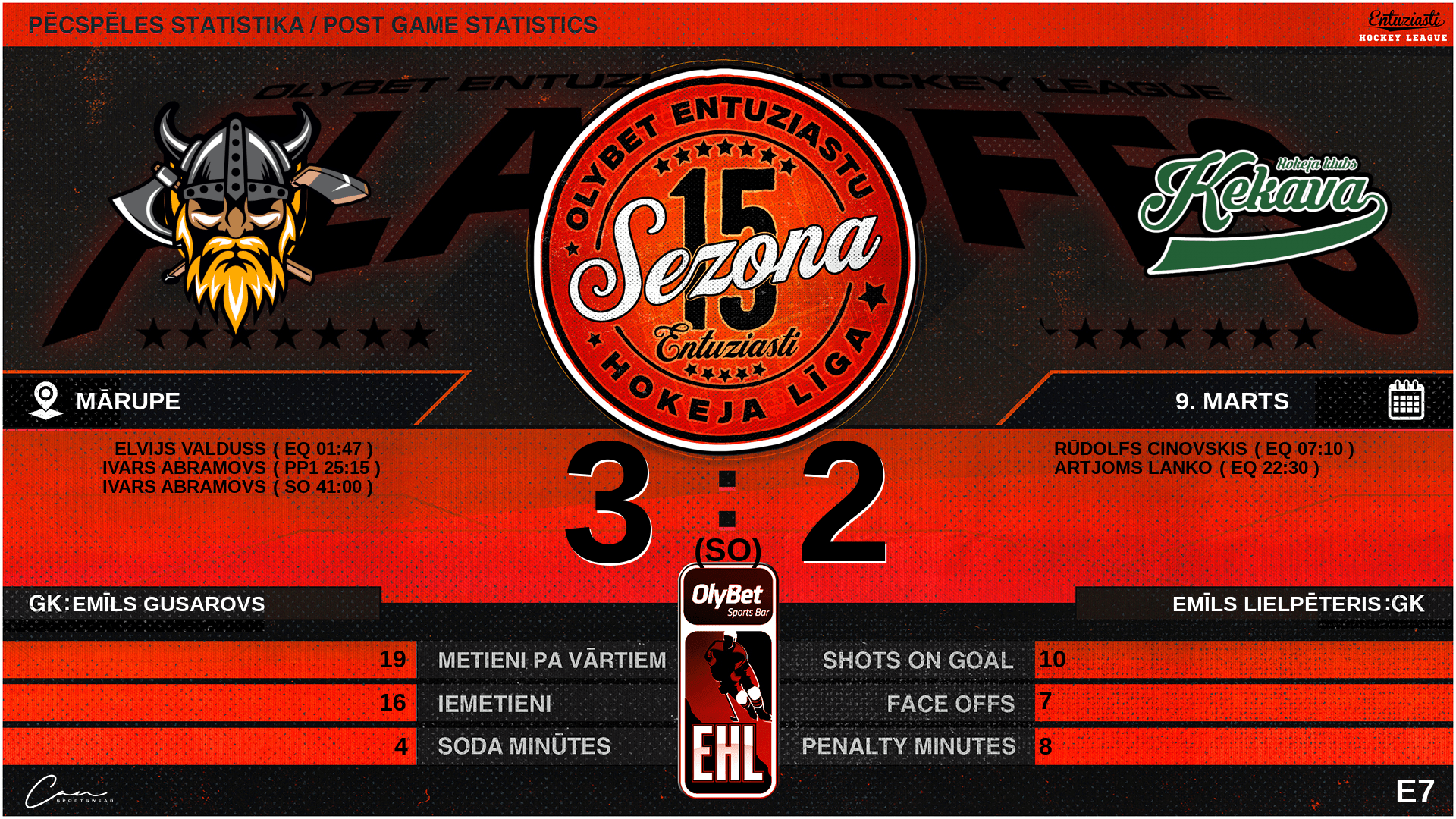 | 41:00 | ĶE3 | GK Out | #2 Emīls Lielpēteris |