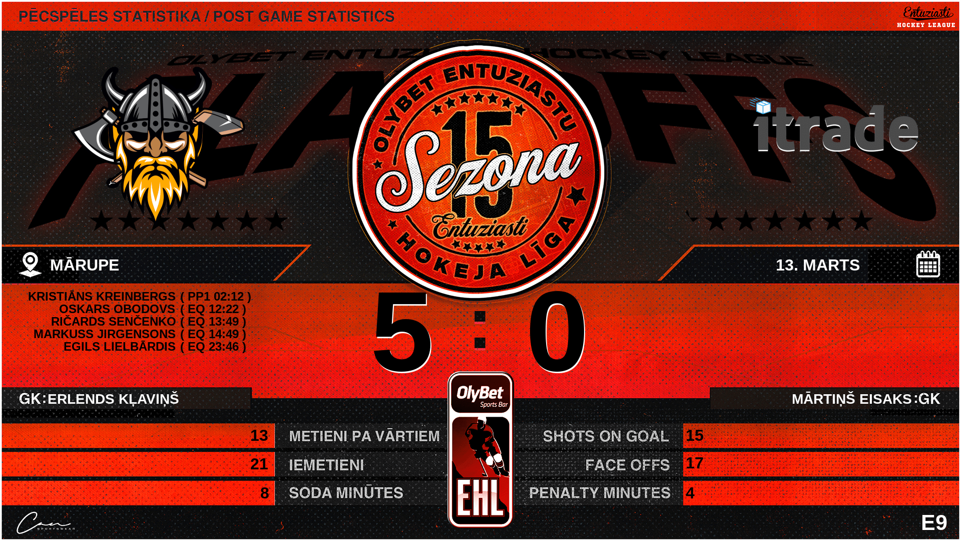 | 02:12 | VN3 | Vārti (PP1) VN3 1 : 0 ITR | #54 Kristiāns Kreinbergs, piespēles: #48 Visvaldis Janelis, #17 Dāvis Mieriņš |