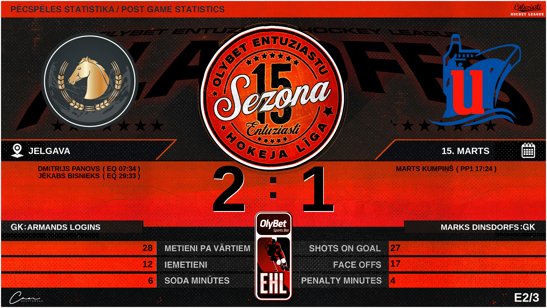 | 29:33 | TRV | Vārti (EQ) TRV 2 : 1 UNI | #49 Jēkabs Bisnieks, piespēles: #5 Krišjānis Reinfelds, #4 Rūdis Akmeņkalējs |
