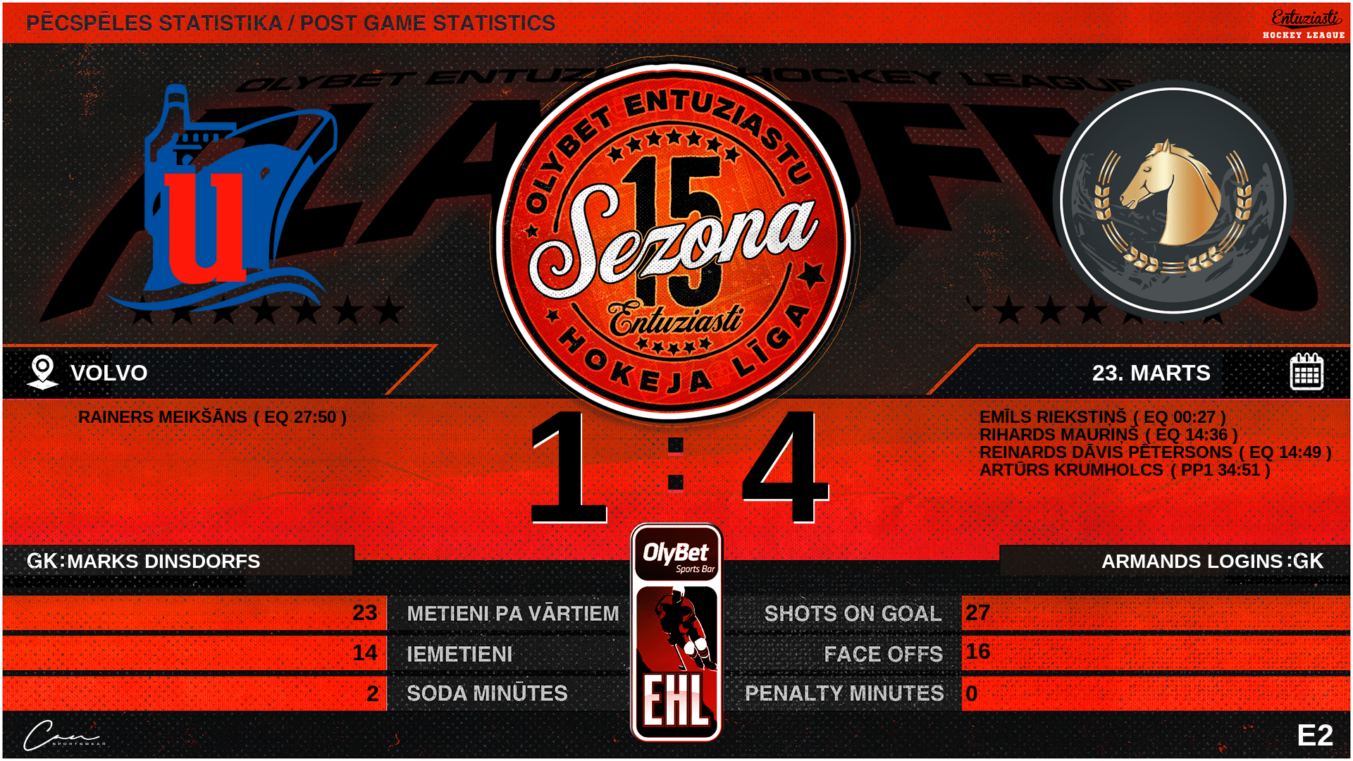 | 14:49 | TRV | Vārti (EQ) UNI 0 : 3 TRV | #17 Reinards Dāvis Pētersons, piespēles: #99 Emīls Riekstiņš, #4 Rūdis Akmeņkalējs |