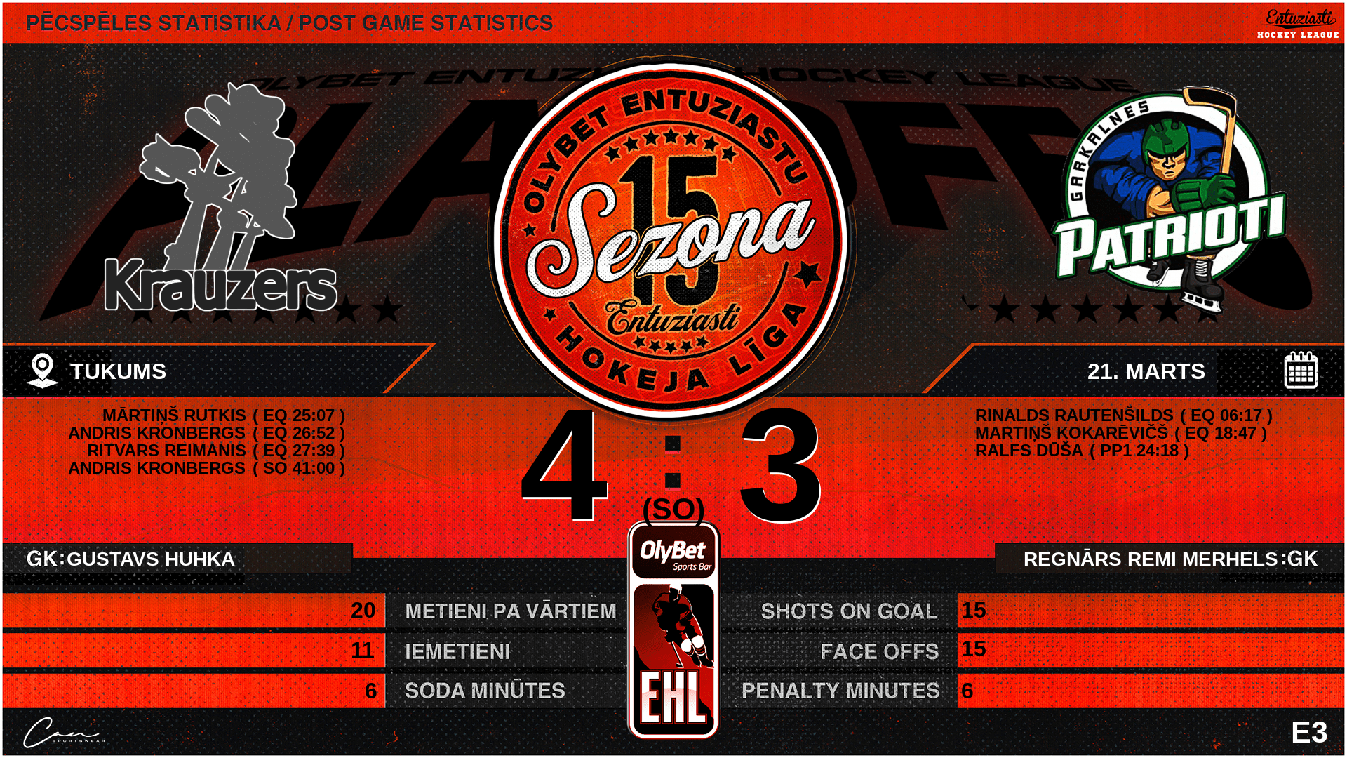 | 25:07 | KRZ | Vārti (EQ) KRZ 1 : 3 GP2 | #77 Mārtiņš Rutkis, piespēles: #78 Artis Belouss, #13 Andis Araks |