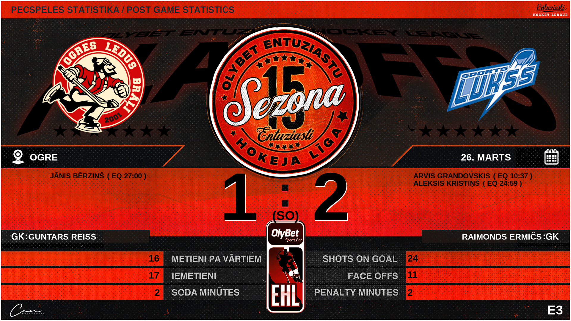 | 27:00 | OLB | Vārti (EQ) OLB 1 : 2 SP2 | #92 Jānis Bērziņš, piespēles: #16 Mārtiņš Vītoliņš |