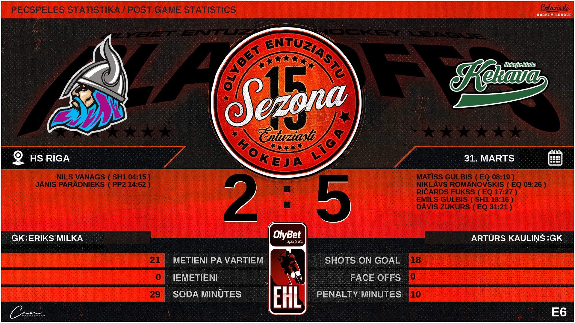 | 31:21 | ĶE2 | Vārti (EQ) LDV 2 : 5 ĶE2 | #24 Dāvis Zukurs, piespēles: #99 Kristaps Bžežinskis |