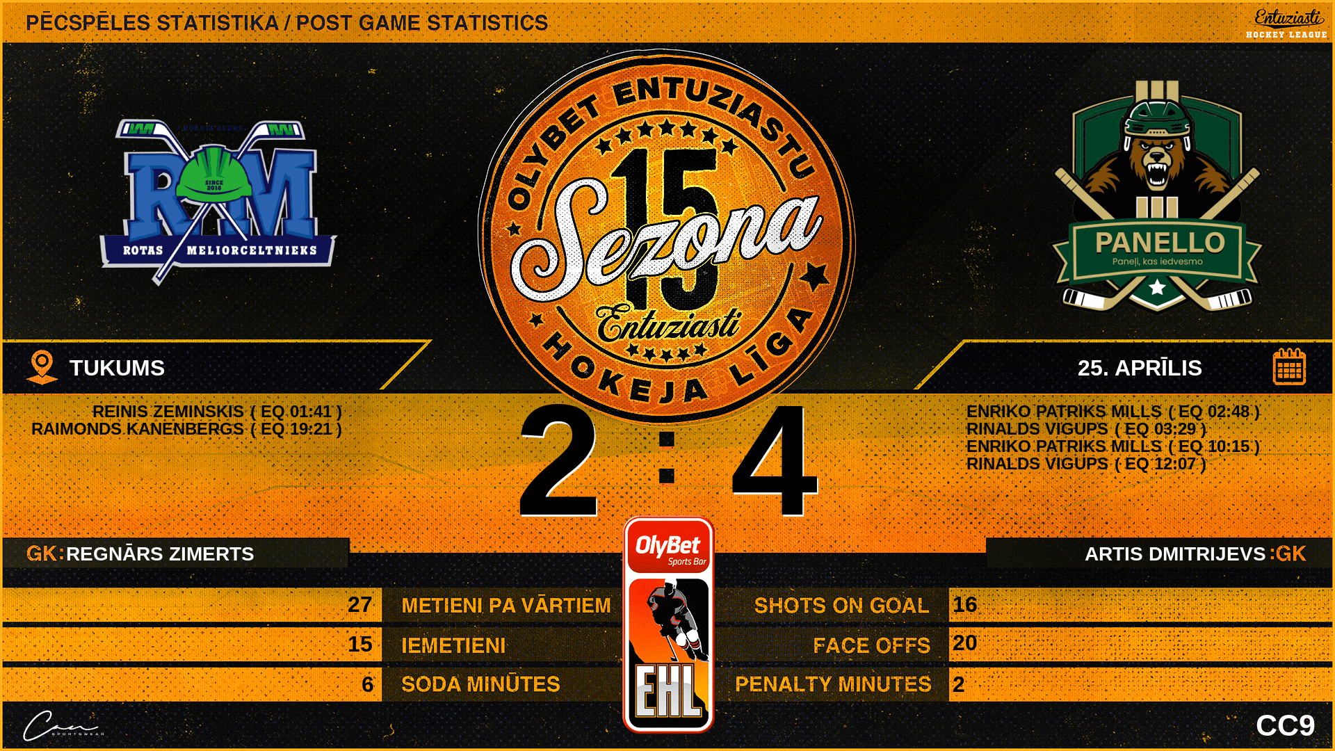 | 10:15 | PNL | Vārti (EQ) RT3 1 : 3 PNL | #77 Enriko Patriks Mills, piespēles: #21 Artūrs Ostrovskis, #91 Uldis Zeile |