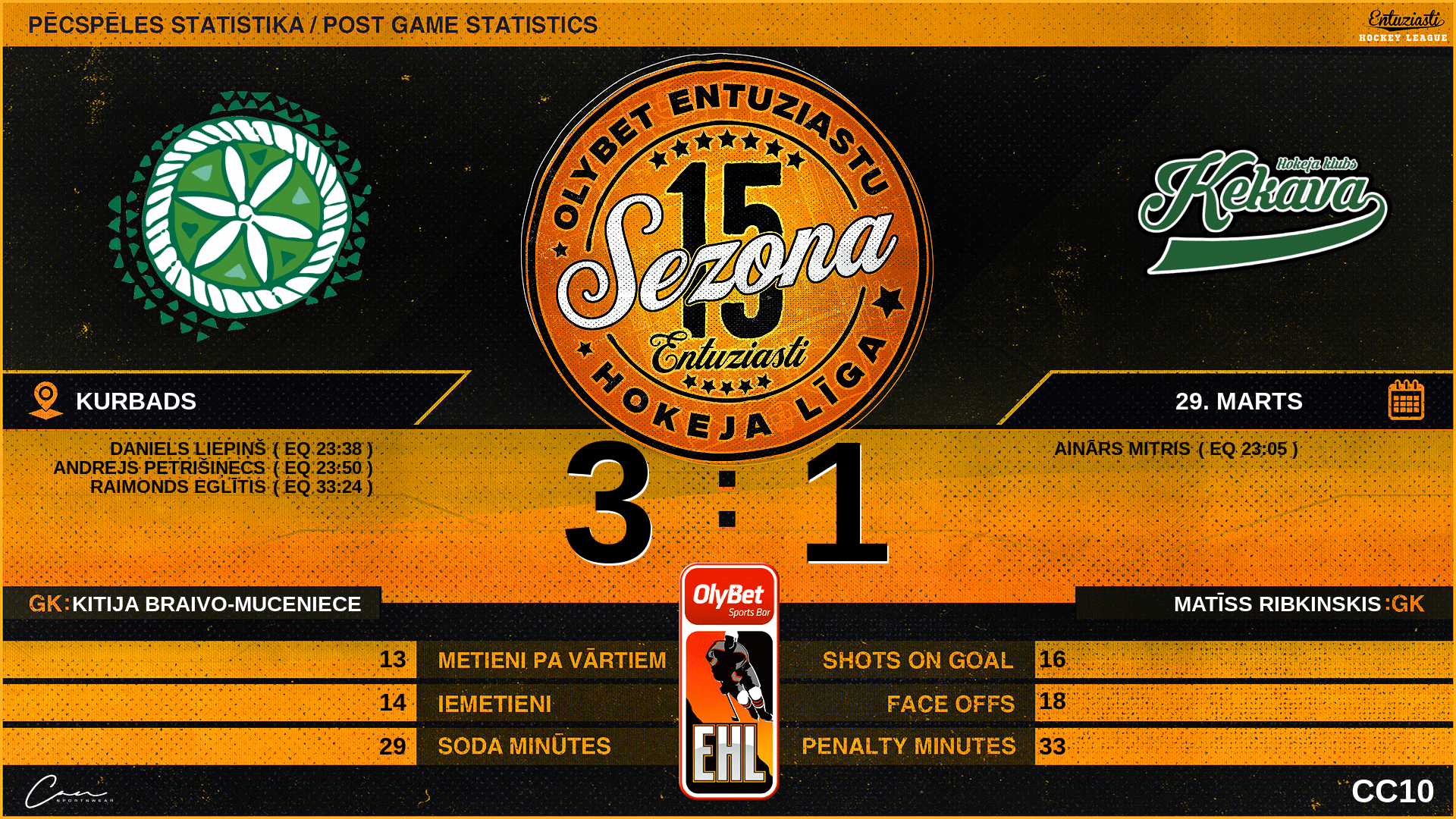 | 23:50 | PC2 | Vārti (EQ) PC2 2 : 1 ĶK5 | #50 Andrejs Petrišiņecs, piespēles: #87 Rūdolfs Bērziņš |