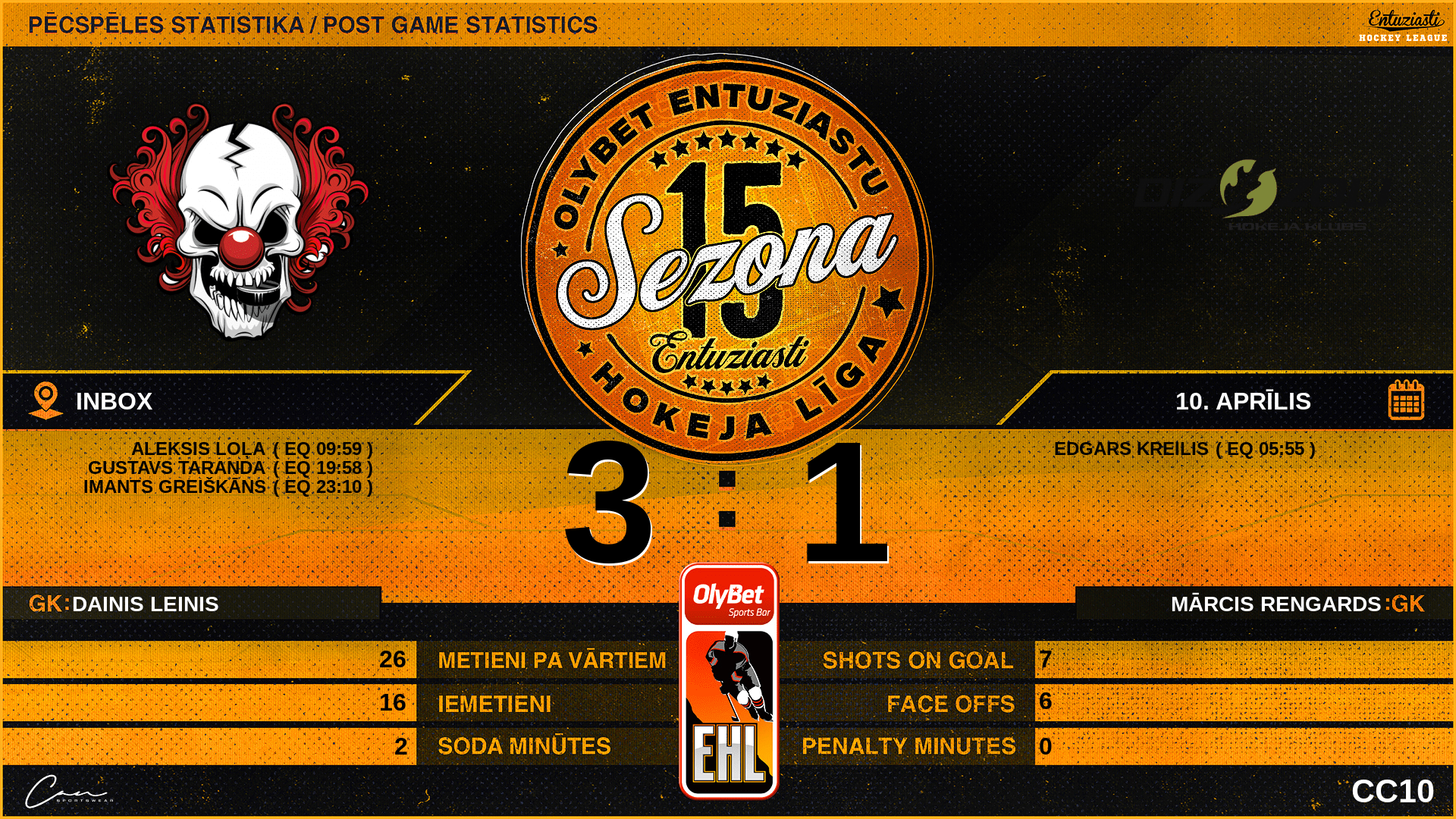 | 09:59 | CR2 | Vārti (EQ) CR2 1 : 1 DZO | #35 Aleksis Loļa, piespēles: #55 Gustavs Taranda, #44 Imants Greiškāns |