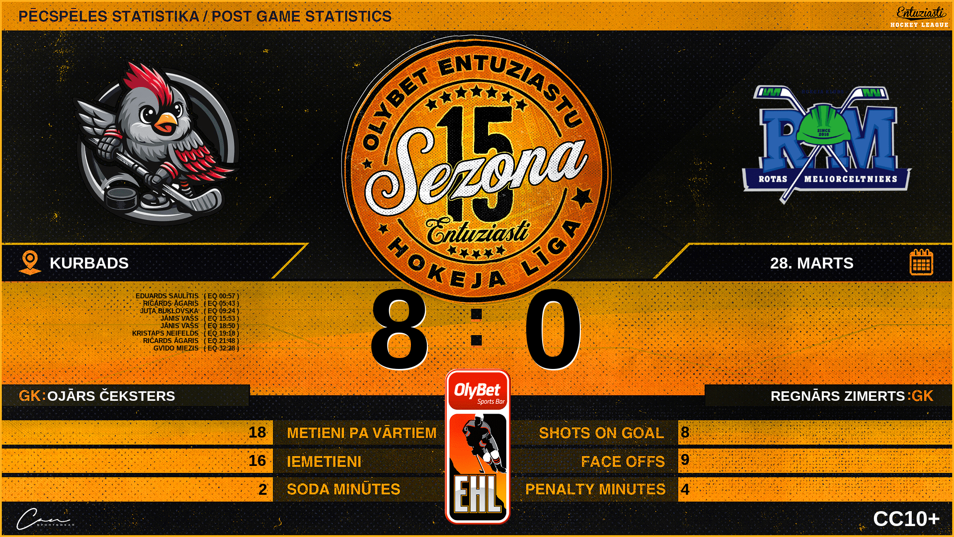 | 18:50 | PKM | Vārti (EQ) PKM 5 : 0 RT4 | #79 Jānis Vašs, piespēles: #22 Roberts Kampiņš, #5 Kristaps Neifelds |