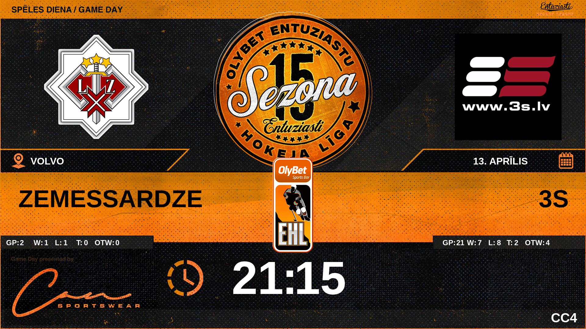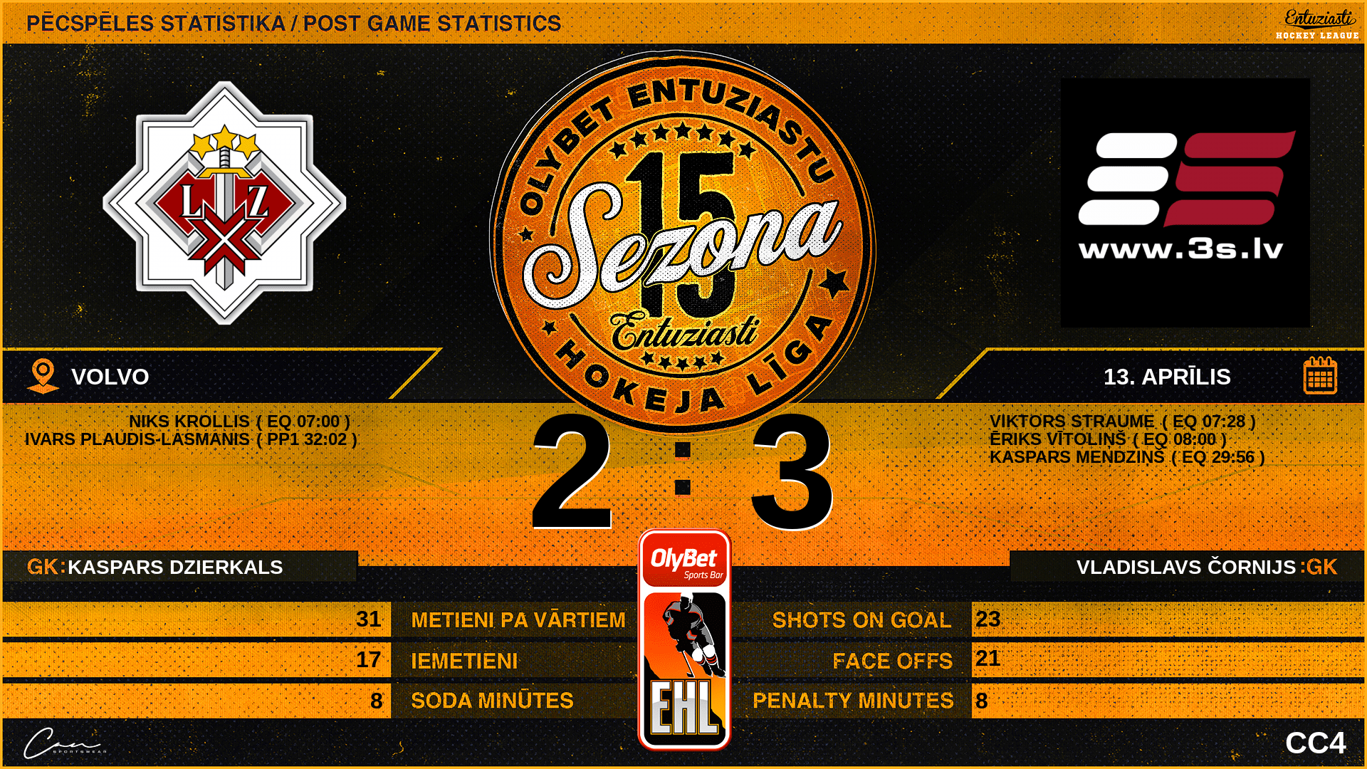 | 08:00 | 3S | Vārti (EQ) ZS 1 : 2 3S | #91 Ēriks Vītoliņš, piespēles: #34 Ingus Dvīnis |