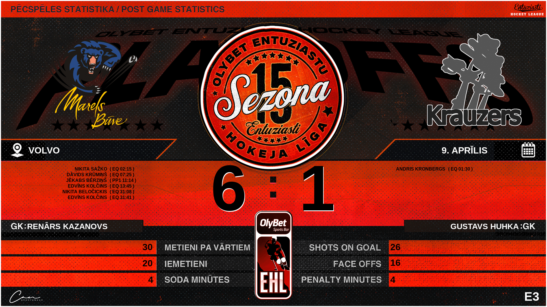 | 36:00 | KRZ | GK Out | #1 Gustavs Huhka |